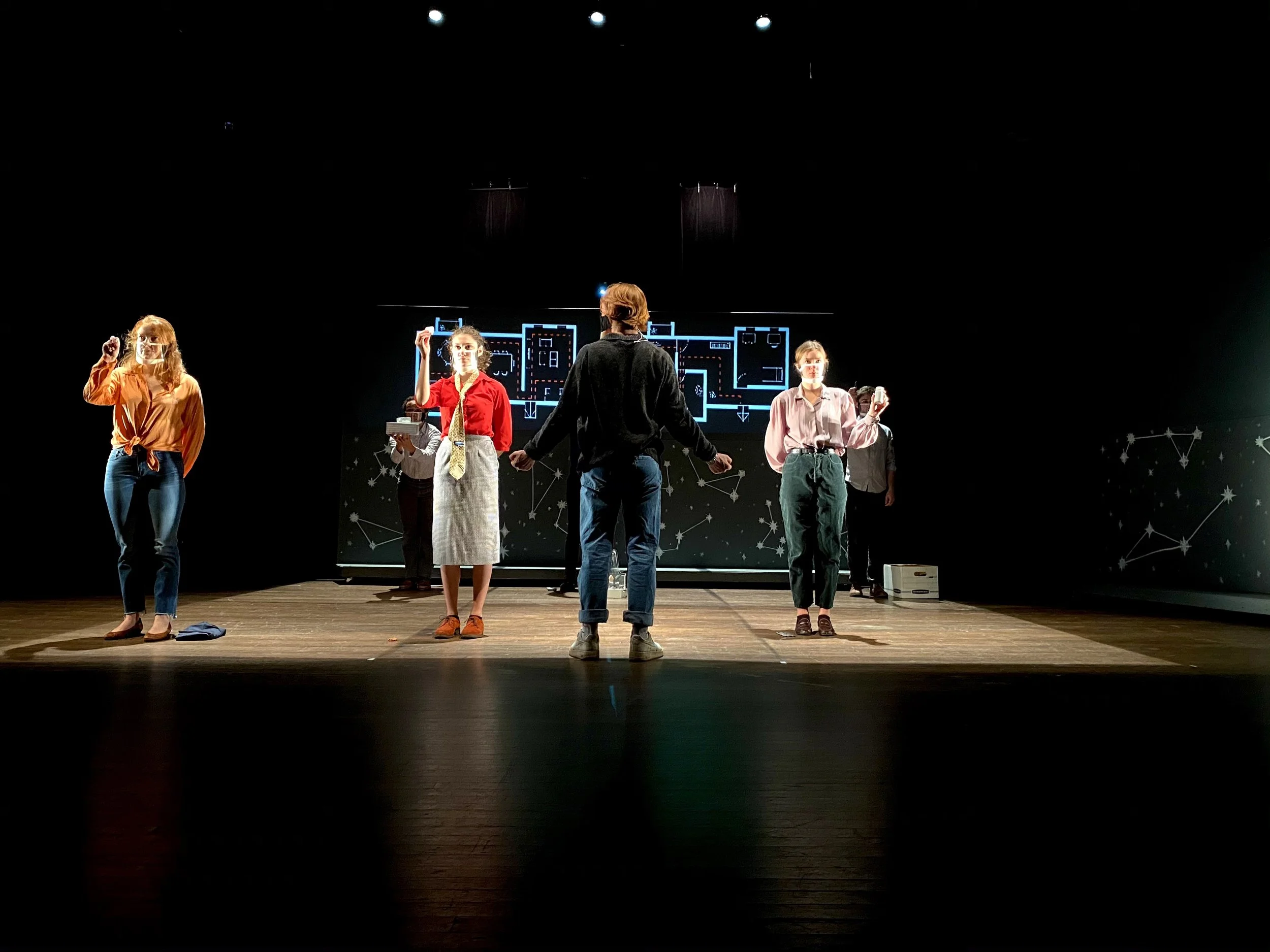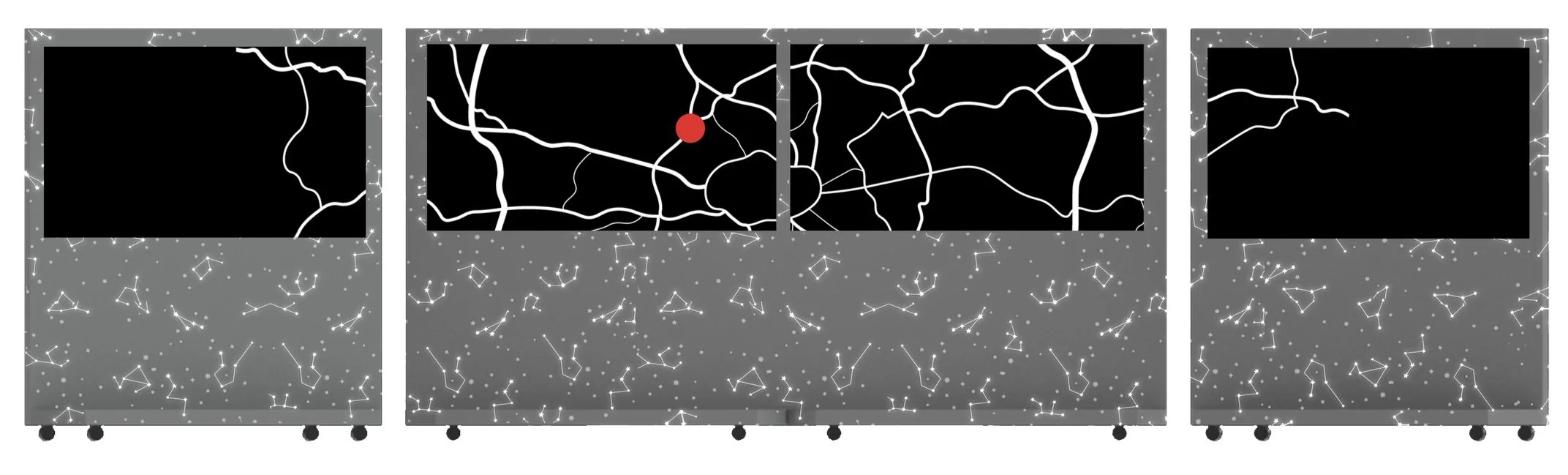 Three projection boards were used as screens to project all designs on. These boards were dynamic and moveable, able to be used independently as seen in the subway scene or come together to create a larger display like when Christopher is surrounded all on sides by his favorite thing: outerspace.