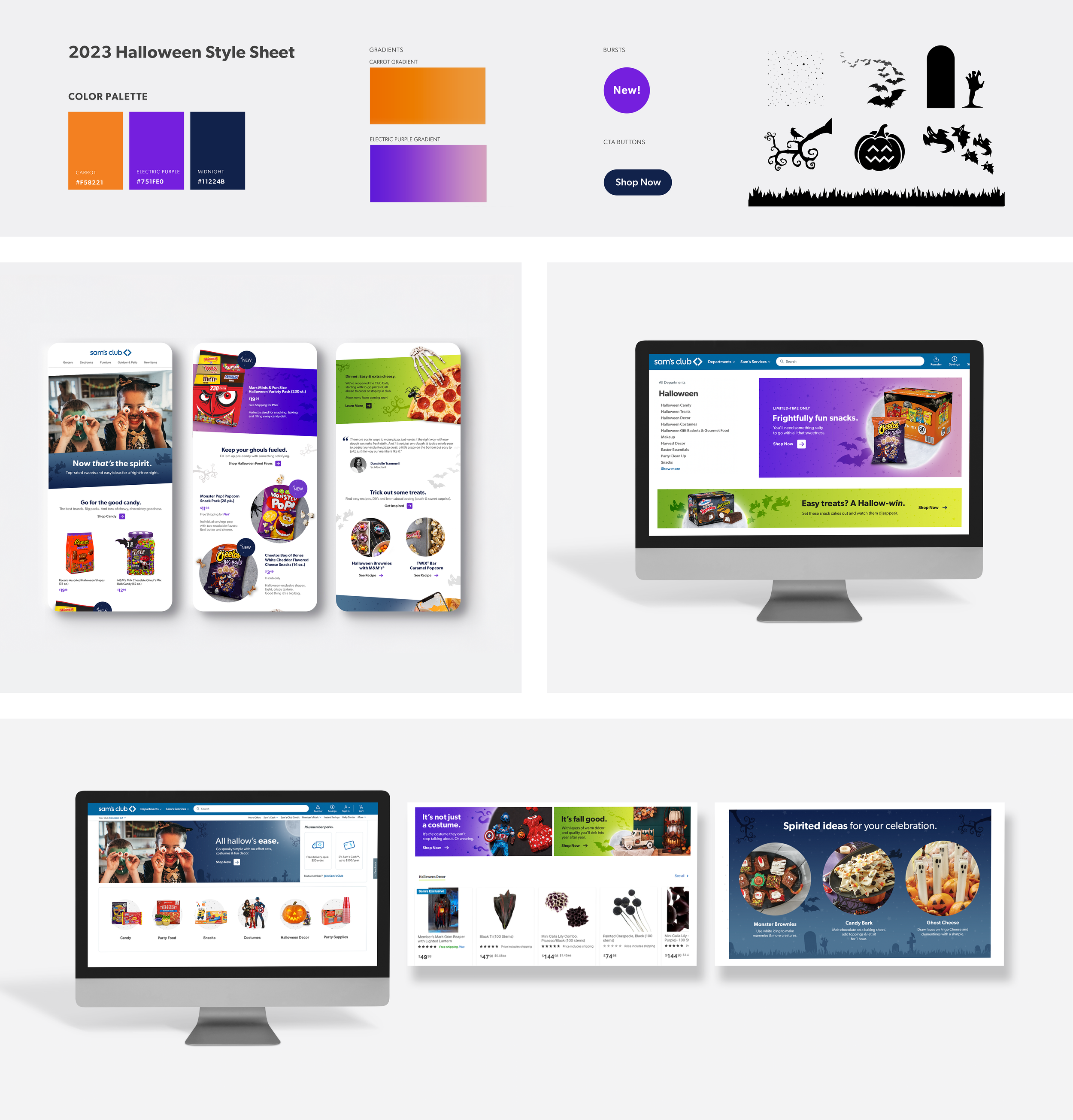 Style guide created for Sam’s Club Halloween (2023/2024), used for the website, email, push notifications, and in store ads. The guide features special use colors “Carrot” and “Electric Purple” to highlight the Halloween season as well our classic Sam’s Midnight to ensure it still ties back to the main brand. I also created a pack of pre-made graphics for other designers to use when creating their own assets.